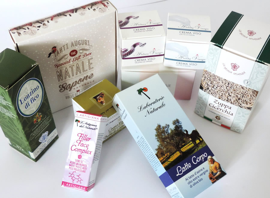 Stampa scatoline personalizzate su diverse tipologie di carta, fustelle con eventuali incollaggi di lembi.
